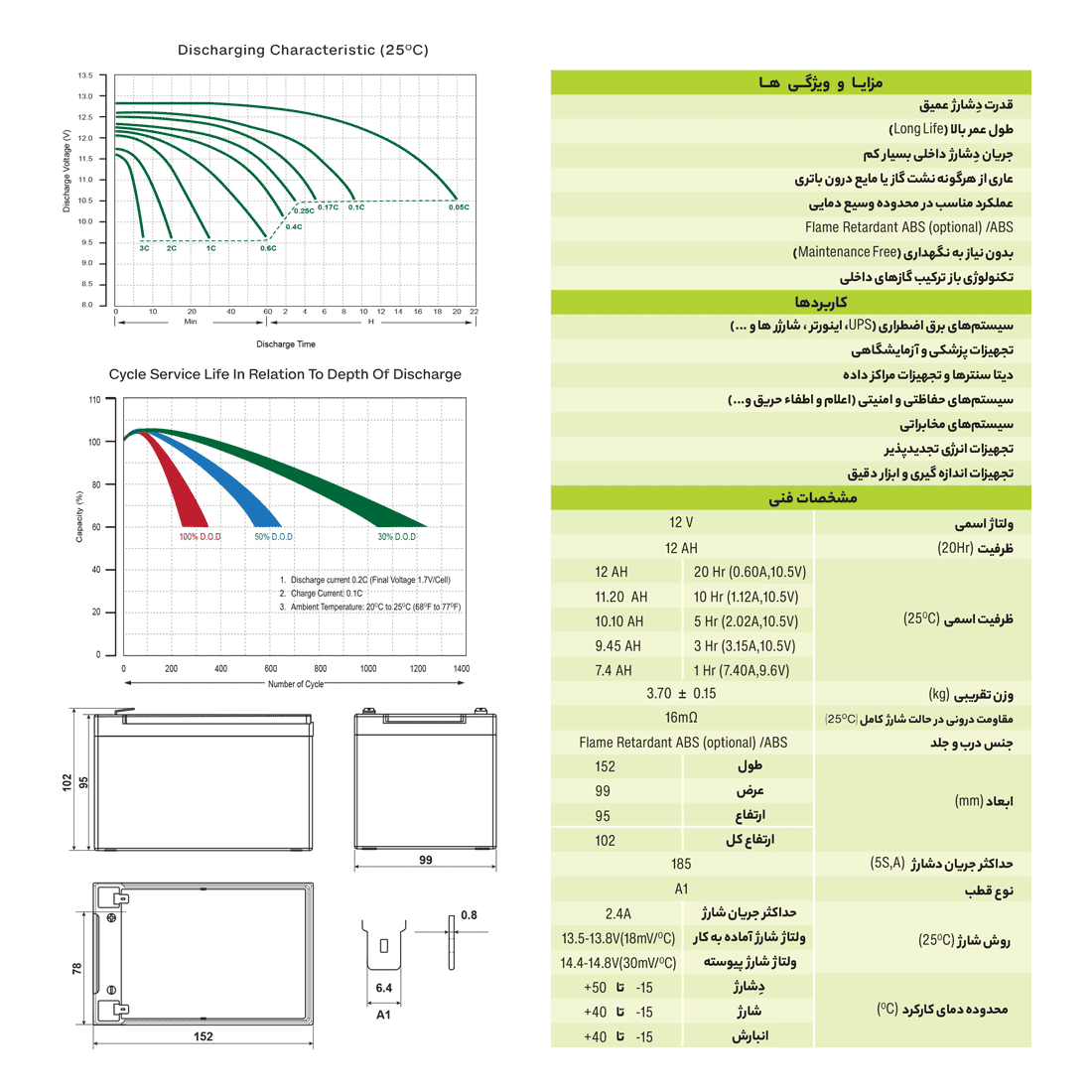 باتری بهخوبی در برابر نوسانات شارژ، شوک حرارتی و لرزش مقاومت داشته و گزینهای ایدهآل برای سیستمهای برق پشتیبان، خورشیدی یا امنیتی است.